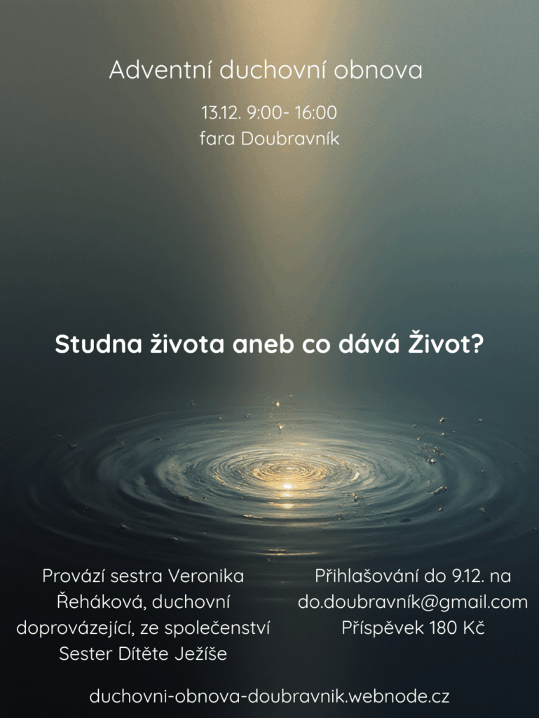 Adventní duchovní obnova s Veronikou Řehákovou, duchovní doprovázející ze společenství Sester Dítěte Ježíše se uskuteční 13.12. od 9h na faře. Přihlašování je možné do 9.12. na do.doubravnik@gmail.cz.